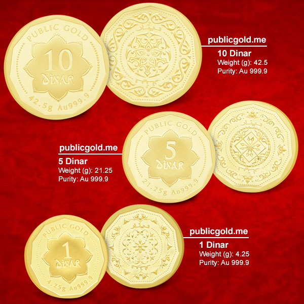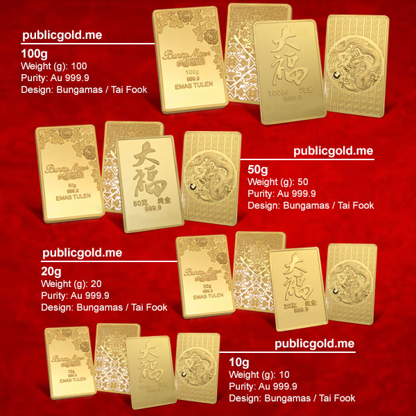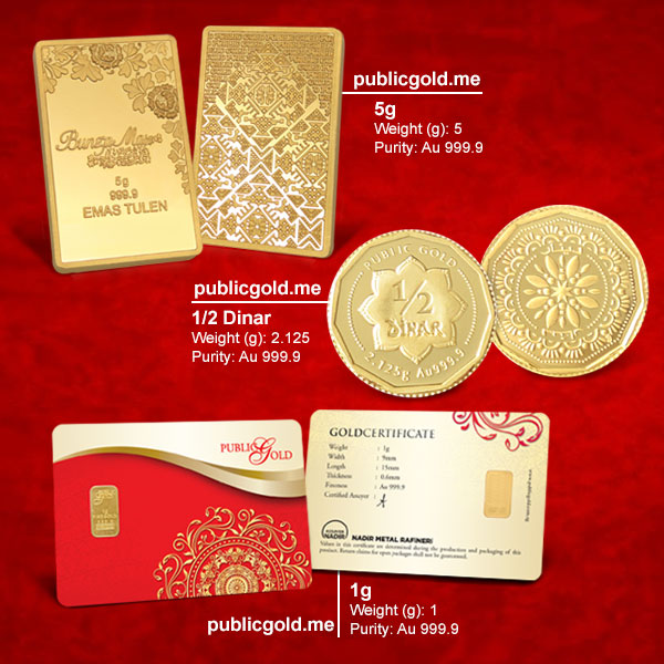 Pelbagai rekabentuk dan saiz emas Public Gold terdiri daripada small bars, set dinar dan gold bars