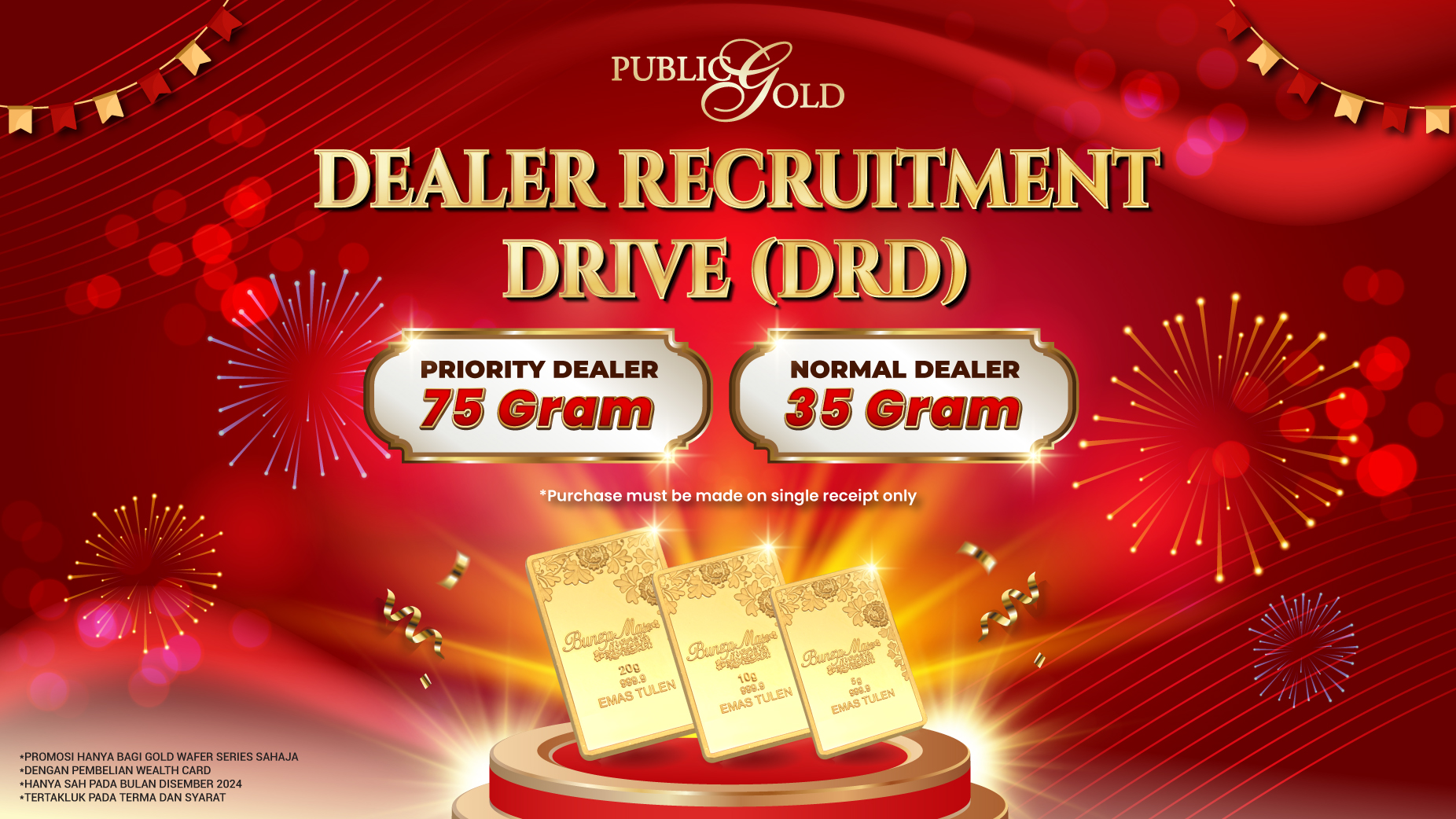 Priority Dealer – Buat pembelian mengikut promosi bulanan dalam 1 resit atau daftarkan 150 orang penyimpan emas dan jumlah pembelian emas oleh diri sendiri dan penyimpan emas yang didaftarkan mencukupi RM150,000 dalam tempoh 12 bulan kebelakang.