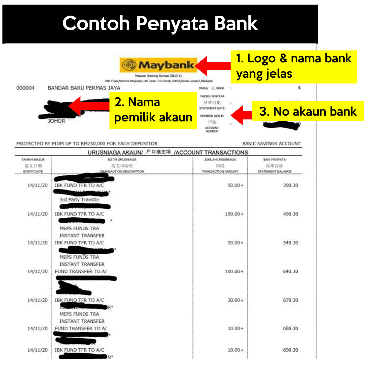 Penyata akaun boleh didapati melalui online banking anda seperti Maybank2u, Cimbclicks dan sebagainya. Contoh penyata adalah seperti di bawah.