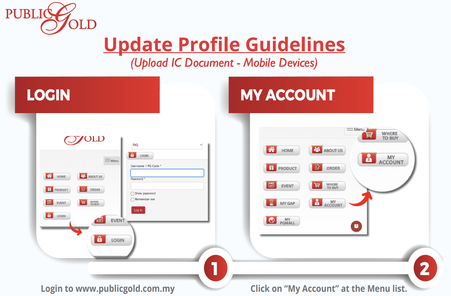 Untuk kemaskini profile dan info bank, klik My Account pada akaun Public Gold anda selepas log masuk.